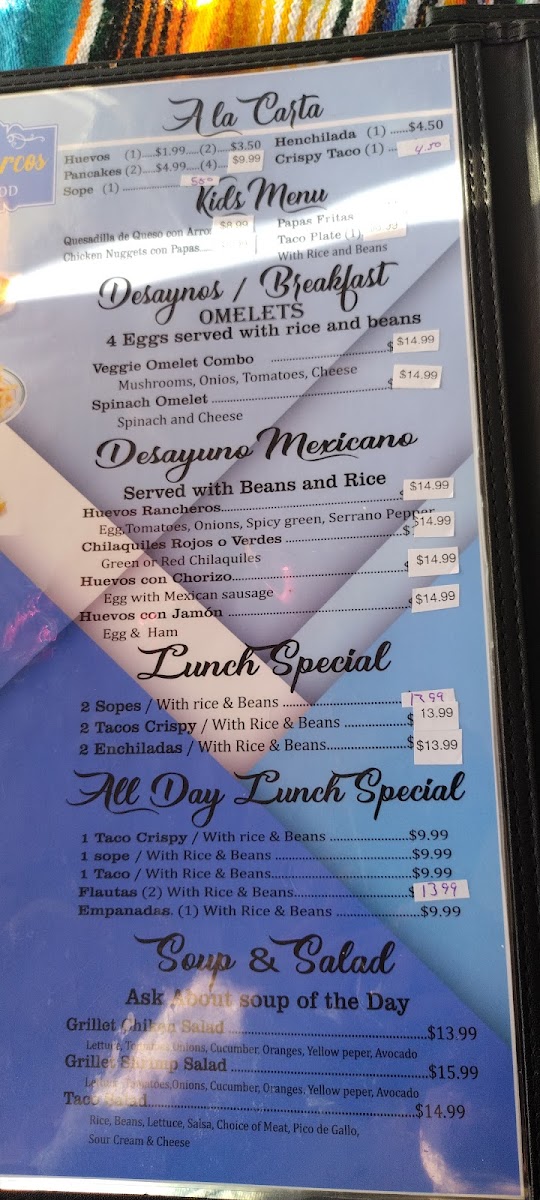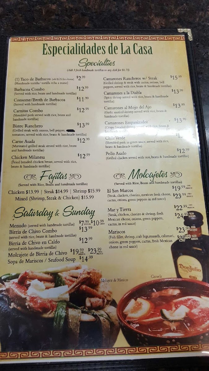 Bistec, pollo, chorizo y queso fresco mexicano, cebollas y pimientos en salsa roja. / Steak, chicken, chorizo and shrimp with mexican fresh cheese, onions, green peppers in red sauce.