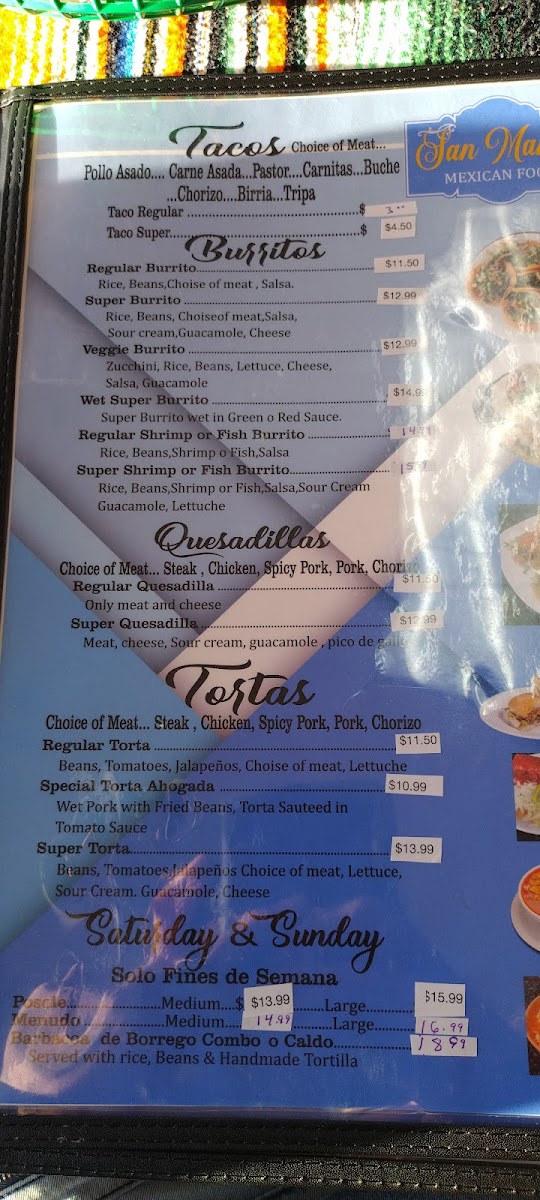 Grilled chicken, beef, pork, spicy pork, pork belly, chorizo, beef stew, tripe.