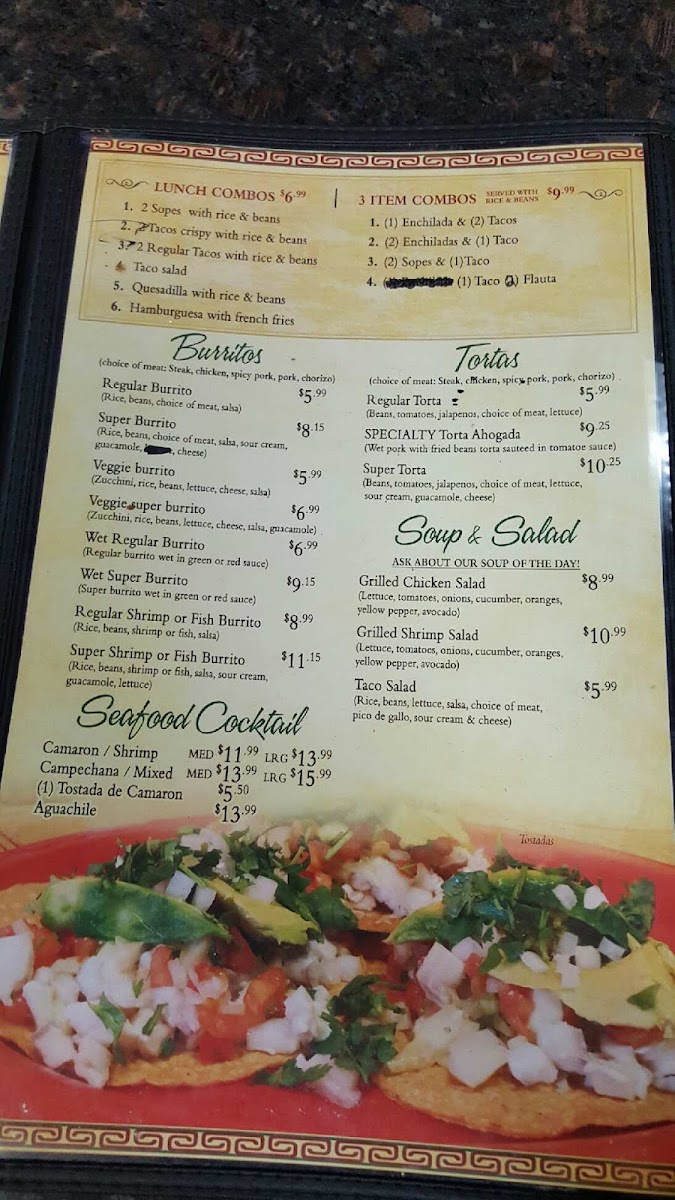 Arroz, frijoles, camarón o pescado, salsa, crema , guacamole y lechuga. / Rice, beans, shrimp or fish, salsa, sour cream, guacamole, lettuce.