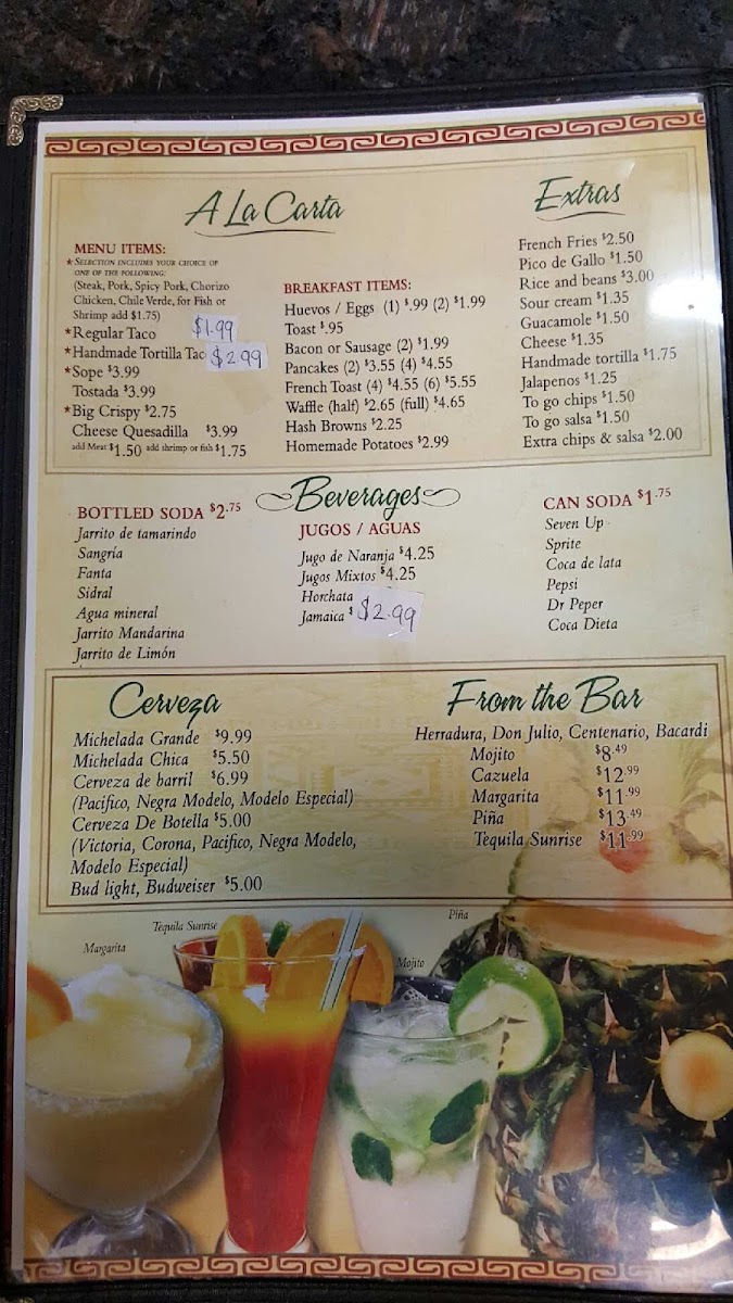 Frijoles, tomates, jalapeños, elección de carne, lechuga, crema , guacamole y queso. / beans, tomatoes, jalapeños, choice of meat, lettuce, sour cream, guacamole, cheese.